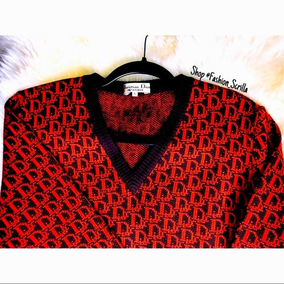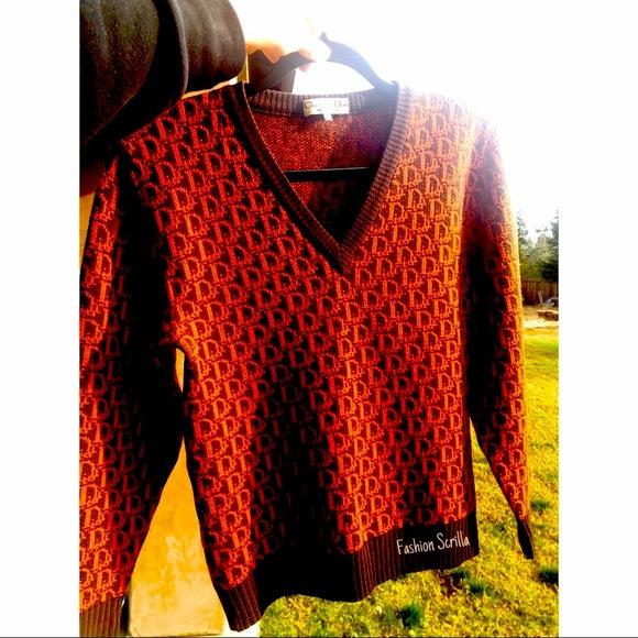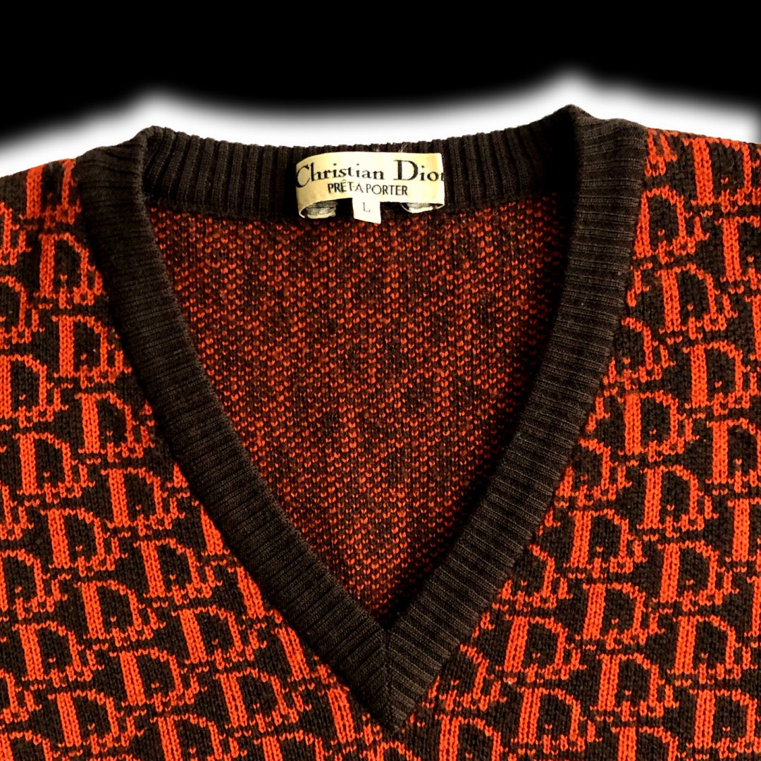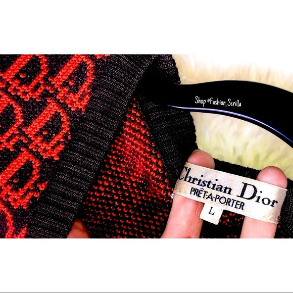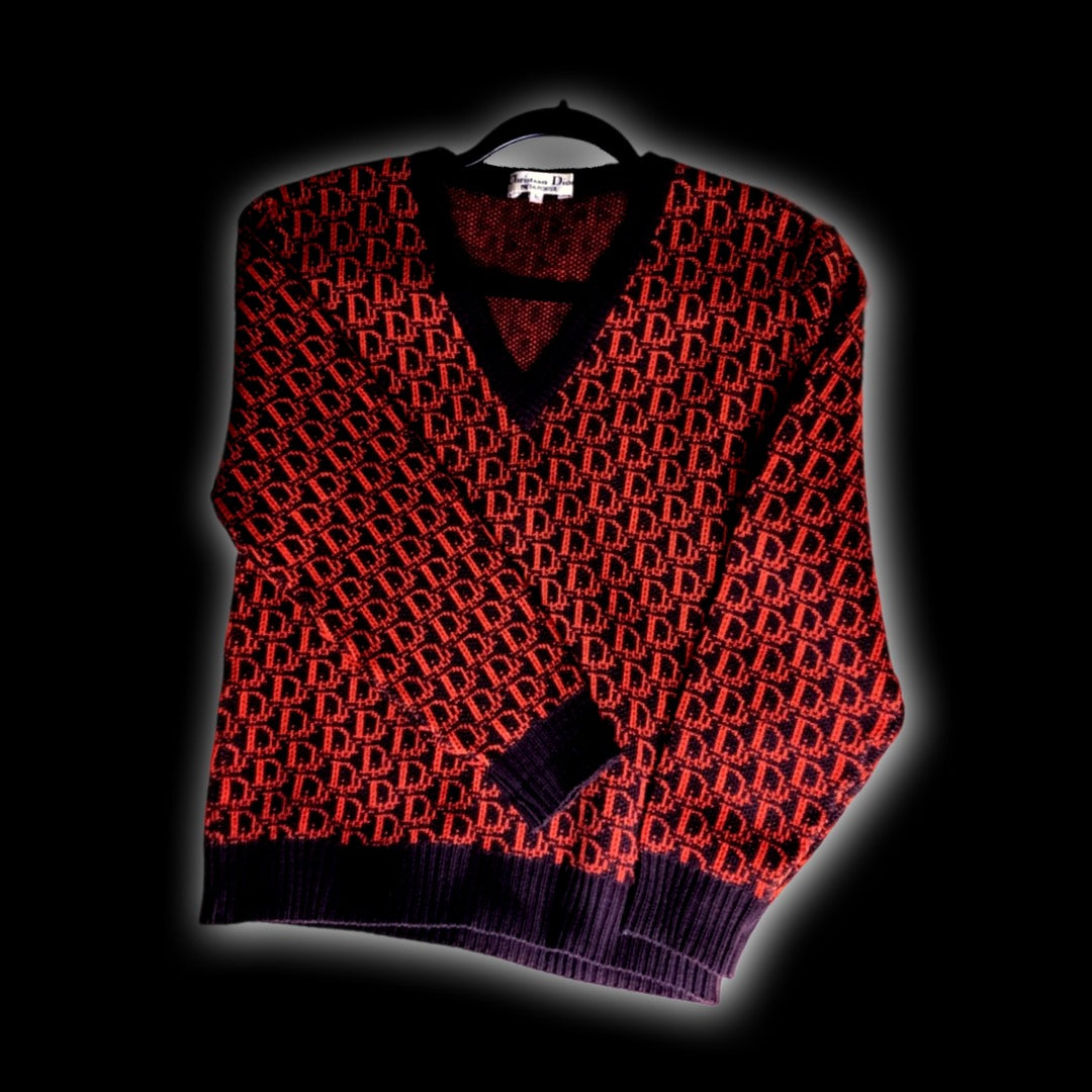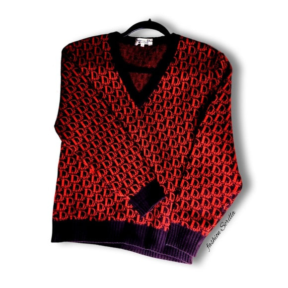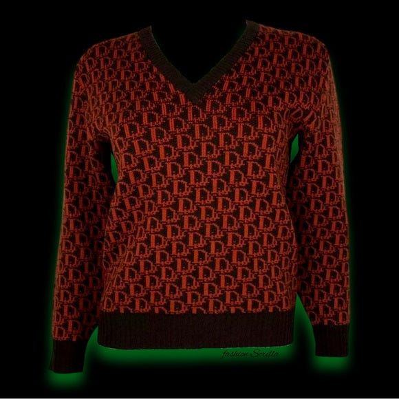 Ultra rare 80’s era Miss Dior Jacquard Monogram logo print V- neck sweatshirt that you won’t find it anywhere else! This archival treasure is a unique, hand knit design, highly sought after by Dior collectors!