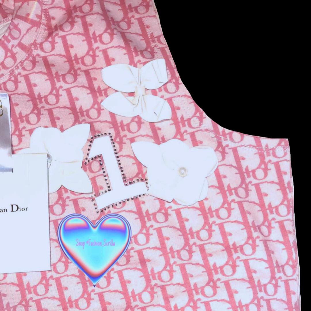 Vintage Christian Dior Girly Pink Monogram Trotter Logo Diamante 3D Flower Appliqué Shirt Top