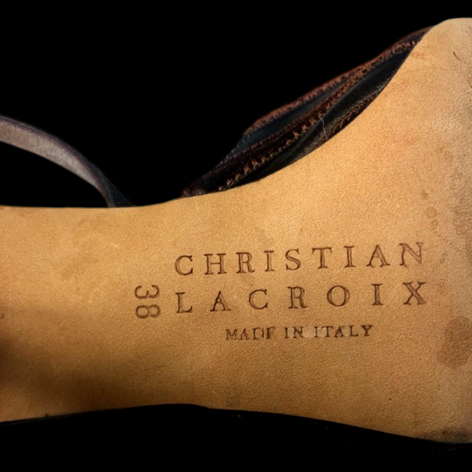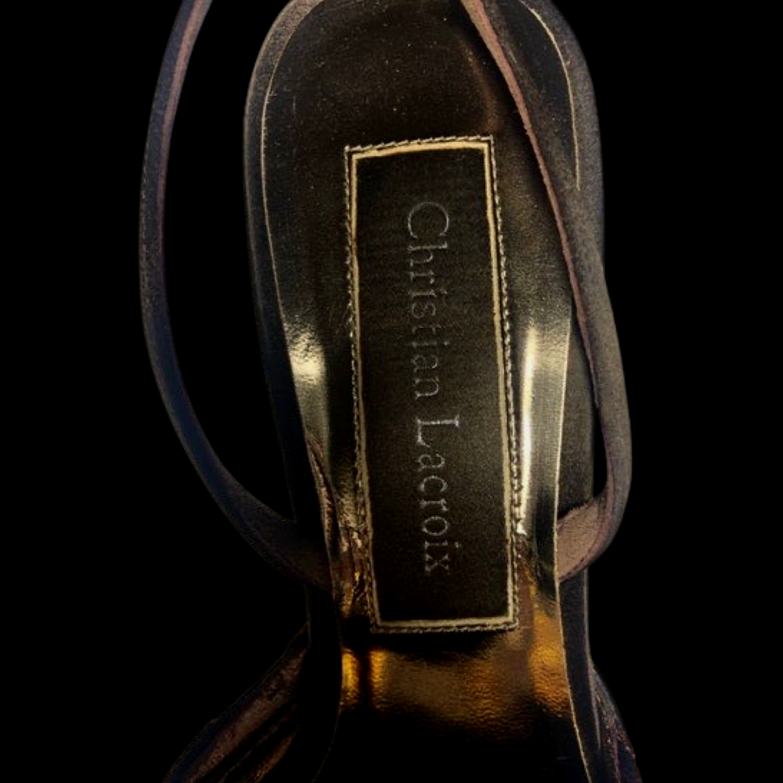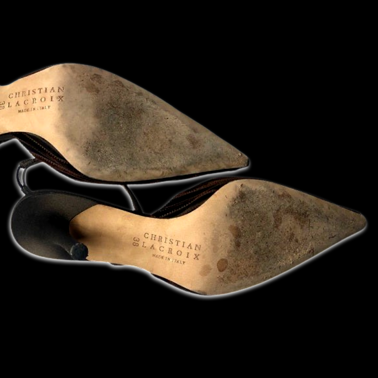 These are rare Vintage stiletto high heel sling back mules by Christian Lacroix. Feature very slim profile with sexy Chic minimalist aesthetic appeal.