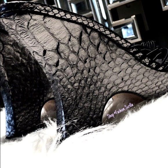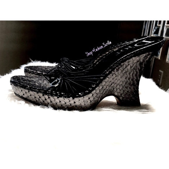 Presenting an Ultra Rare 20th century John Galliano era designed platform sandals in excellent preserved condition! 100% Authentic exotic python skin platform in a lovey metallic black black color!