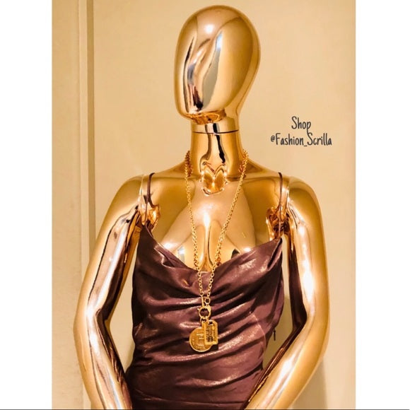 This elegant mini dress is a rich bronze tone with a golden shimmer sheen dimension. Major bronze goddess vibes emanating, a go to dress for date nights and special occasions.