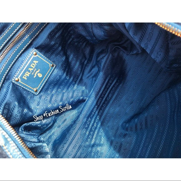 Vintage Prada Saffiano Top Handle Medium Leather and Denim Handbag Convertible With Long Crossbody Strap Bauletto Bag