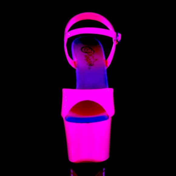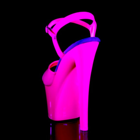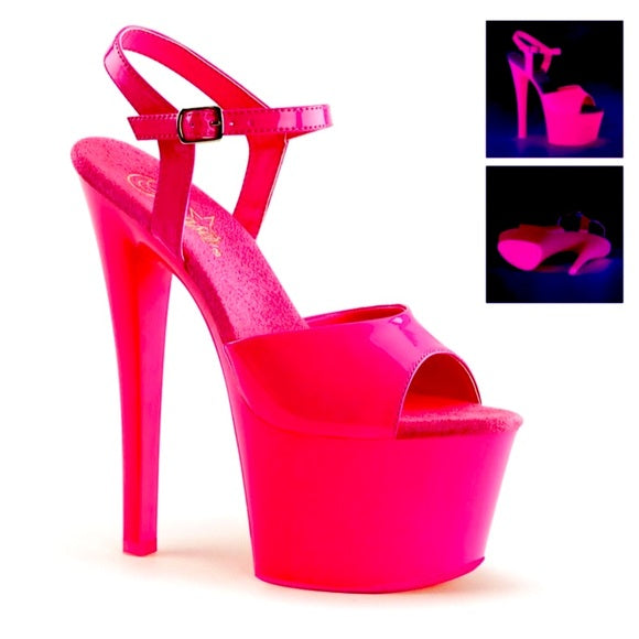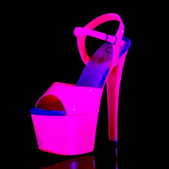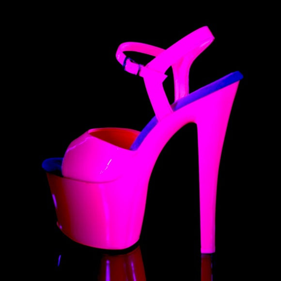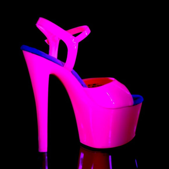 Light up the dance floor in these Sky High platform sandals from Pleasers Exotic Dancing collection! These are stunning to look at not only in daylight, but even more exotic when the black light comes on and the UV starts to glow that hot pink! You will look amazing, certainly no one will miss your footwork.
