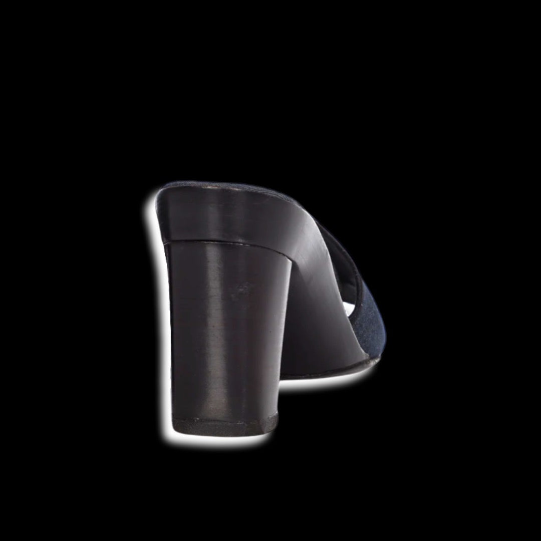 Vintage Chanel CC Monogram Logo Mule Denim With Black Leather Chunky Platform Stacked Block Heel Mule Sandals