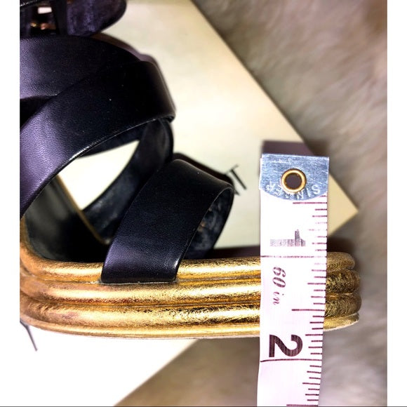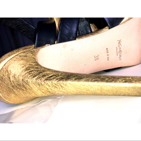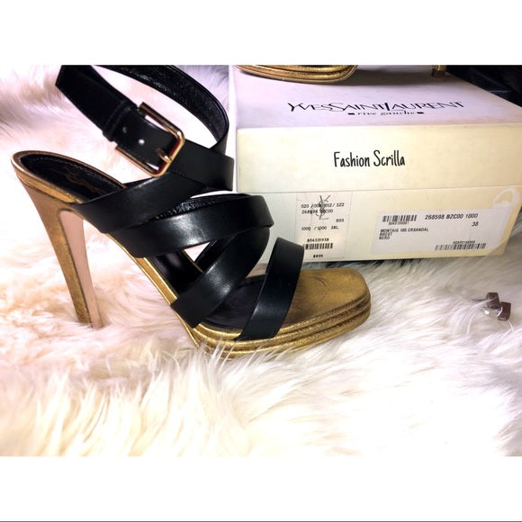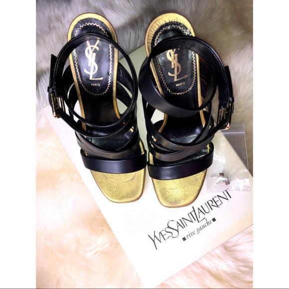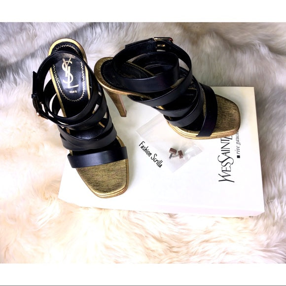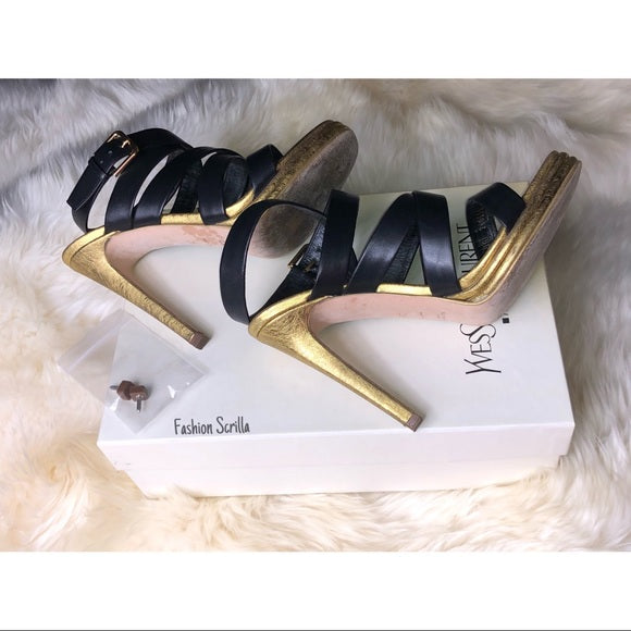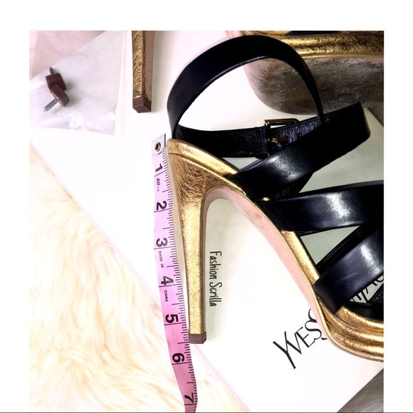 Vintage Yves Saint Laurent Montaig Nero Black And Gold Leather 105 Strappy Sandal Platform Heels