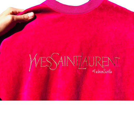 Vintage YSL Hot Pink XL Spelled Out Embroidered Yves Saint Laurent Monogram Logo Velour Sweatshirt